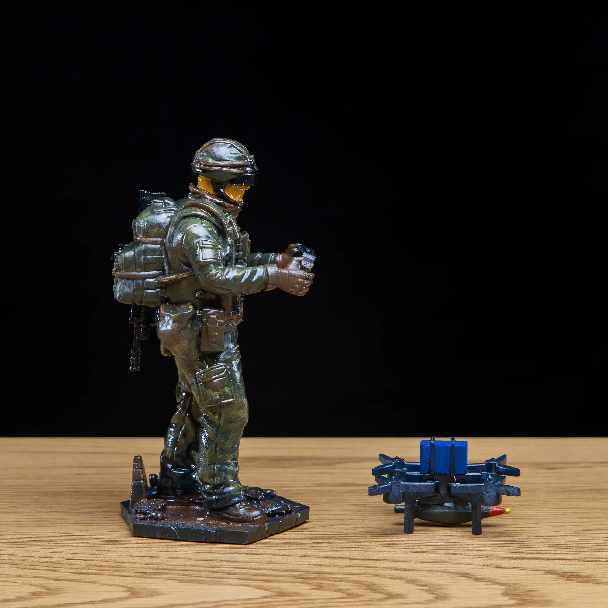 У наборі: детально виконана фігурка FPV-оператора у військовій формі, модель дрона, та фірмова дерев’яна коробка з логотипом PENTAGON. Розмір фігури 73*55*133 мм